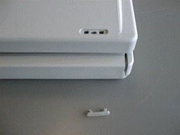 このうち,左右のゴム足を外します.小さなマイナスドライバーでひっかけるとうまく外れます.