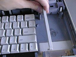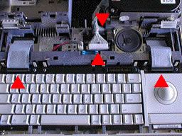 キーボードは,図中▼に示す計6箇所の爪で固定されています.はじから一つずつ解除して持ち上げて下さい.これも結構大変な作業です.