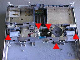 ロジックを守っているフレームは3箇所の爪(図中の上向き▲)によりきょう体に固定されています.そこでこれを解除してやりますが…