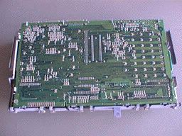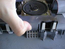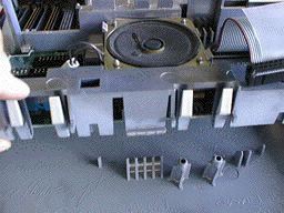 ロジックボードを取り出す前に,電源コネクタ(図中の下向き▼左側)とスピーカーコネクタ(同▼右側)を外しておいて下さい.