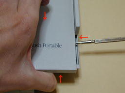 それと同時にベゼル(液晶側のパネル)を人差し指と中指で下矢印の方向に,ハウジング(液晶裏のパネル)を親指で上矢印の方向へ押し込みます.