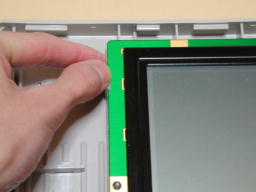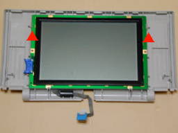 【2】LCDを外す ディスプレィベゼルを取り去ったところです. 図中上向き▲(2箇所)はLCDを固定するマウントクリップです. この左右のクリップを解除してLCDを取り外します. LCDの表側です. 同じく裏側です. 必要に応じてディスプレィケーブルを外します.
