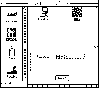 まずFTPサイトを探してMacTCP1.1.1とMacPPP1.1.3(Config PPPとPPPを含む)を入手します.ヴァージョンに注意して下さい.