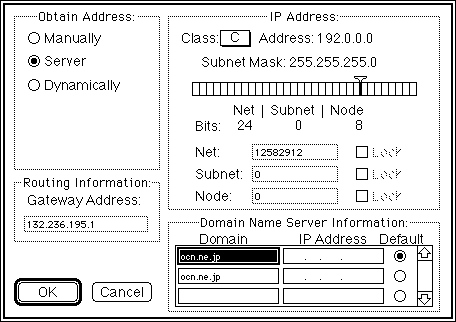 ここでは,「Obtain Address」を「Server」にして,後は「Domain」と「IP Address」を入力します.