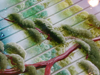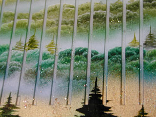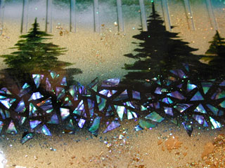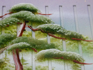 アップです. 遠景はこのようにスリットの部分が生かされて絵が途切れていますが… 近景の松は樹脂の上に描かれているので,線が連続しています.本当に近くにあるよう. 斜めから見ると,スリットの底に松の「影」が映っているのです! 絵は何層かに塗り分けられているので,近くで見ると立体的に見えます. そして,見る位置を変えると,色も変化するのです. *裕峰先生と大西さんに深く感謝申し上げます.