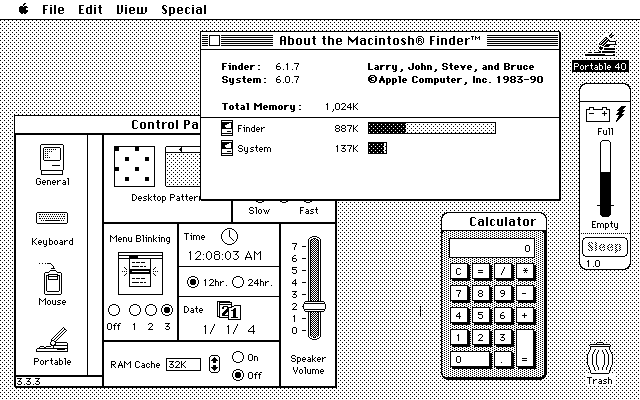 別に深い意味は無いのですが,Portableのデスクトップ画面(System 6.0.7)をキャプチャーしました.こちらです.シンプルでしょ?RAM 1MBでも立派に使えます.(笑)