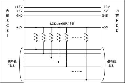 ターミネータを内蔵していないハードディスク等を使用する場合,この回路図に従って信号線をプルアップして下さい.そうすれば多分うまく認識されると思います.