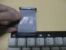 これがそのケーブルです.コネクタをキーボードから外そうと薄い透明フィルムを引っ張ってもこのフィルムが伸びるだけで決して外れません.(爆)