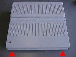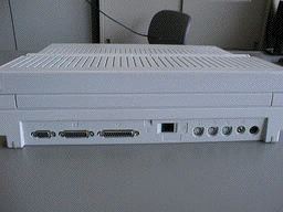 向かって左より順番に,外部ビデオ出力(要専用ビデオアダプタ),外部FDD,SCSI(デスクトップ型と同じ25ピン),内蔵モデム用モジュラージャック,ADB,プリンタ,モデム,音声出力(ステレオ),ACアダプターの各ポートです.