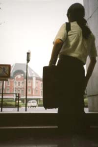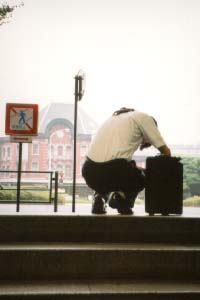 大きな荷物を肩から抱え,地下からの階段を昇ってくる怪しげな後ろ姿の一人の男.