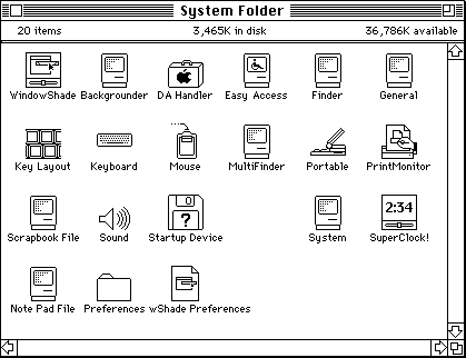 システムフォルダの中身です.コントロールパネルや機能拡張等システム関係のほぼ全てのものが同じヒエラルキーにあるため,全く整理されていないように見えます.(笑)
