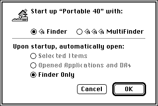 System 6はデフォルトではシングルファインダ(つまり,アプリケーションを一つしか起動出来ない)です.マルチファインダで使いたい場合(早期のヴァージョンを除く)は,「Special」メニューの「Start up」を選択してこのウィンドウで設定します.