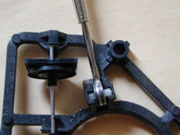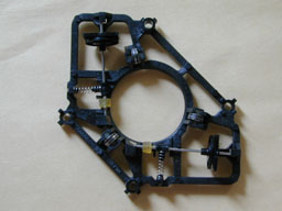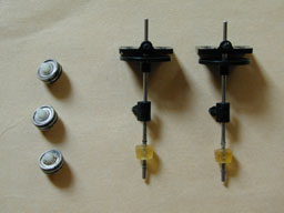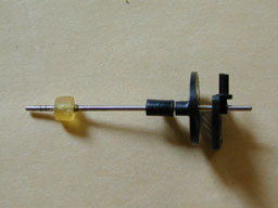 内側フレームに,金属性ガイドローラー等が固定されています. マイナスドライバーを用いて,てこの原理でこれらローラーを外しましょう. 取り外した可動部品です. このガイドローラーにゴミが付着していたり,錆び付いていたりすると引っかかりの原因となりますので,よく掃除して下さい. この左側の黄色いゴム(?)がべたついてスムースな動きの妨げとなりますので,これもきれいにします.