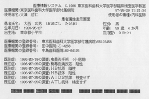 システムが起動すると、最初にそのコンピュータの使用を許されている者のID番号とパスワードの入力を要求する。これは担当の医師以外の者による不正なシステムの使用を防ぎ、患者のプライバシーを保護するための手続きである。使用者の確認が済むと、システムは光カードに記録されたデータを検索できる状態になる(図3)。患者から光カードを受け取った医師は、まず裏面に印刷されている氏名、年齢、顔写真などにより本人のカードであることを確認する。これは患者が他人の光カードを偽って持参することを防ぐための手続きである。