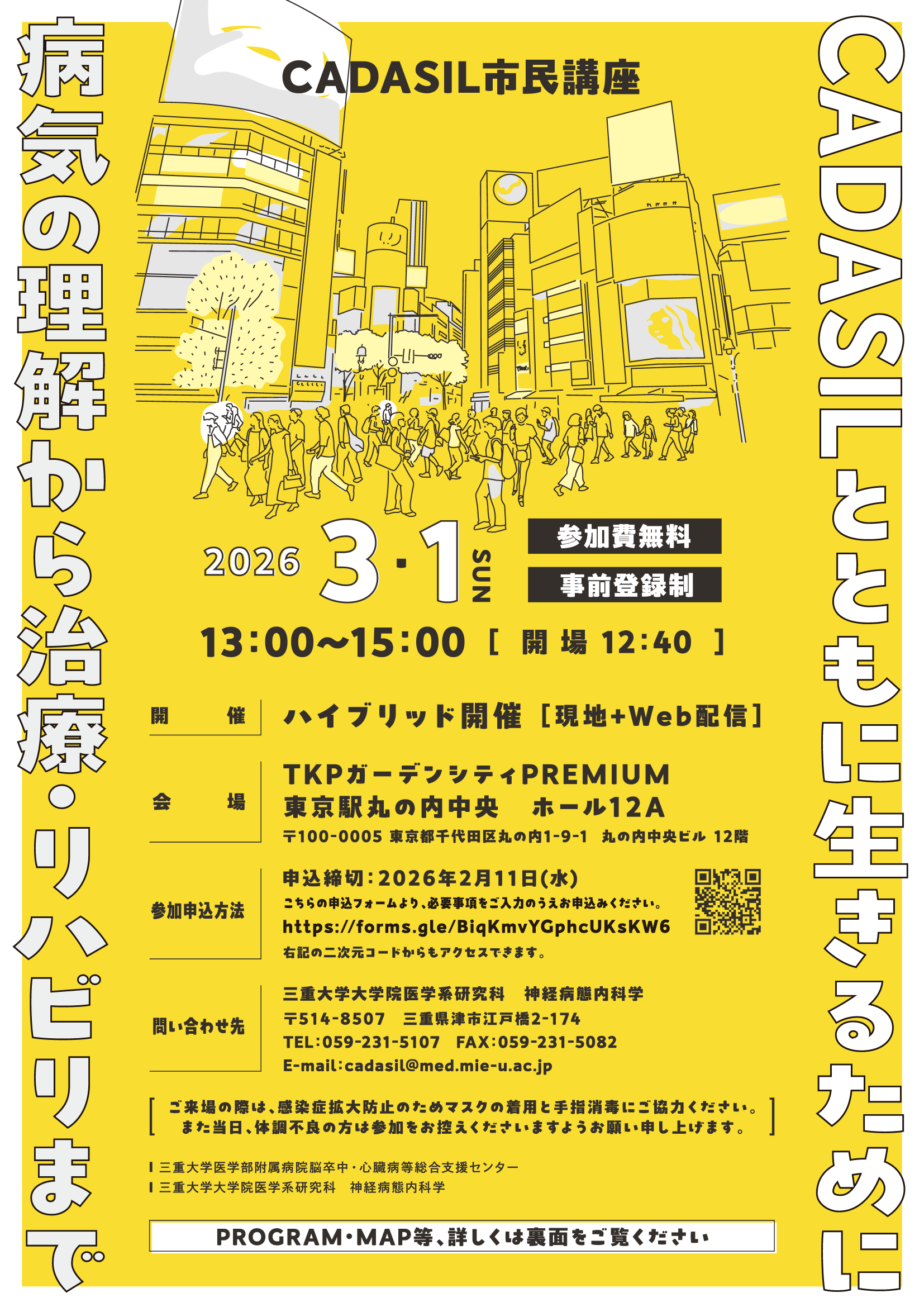 こちらは、三重大学を中心とする複数の研究機関が日本医療研究開発機構研究費・ 難治性疾患実用化研究事業の一環として、遺伝性脳血管病CADASILに関する詳細かつ最新情報を配信しています。