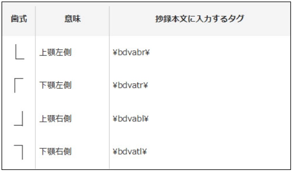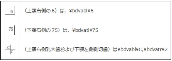 入力順序は、必ず上下、左右、歯種の順で表現し、上下左右にまたがる場合には、上顎から下顎へ、また、右側から左側の順で表現してください。印刷の場合、歯式は、上下顎を同一行で表現はせず、上下別に表現します。記号入力は、1行に1顎の原則で、特殊記号であることを表現するため最初と最後は¥(半角の円マーク)で挟んで入力してください。2つ以上は、(半角カンマ)で区切ってください。