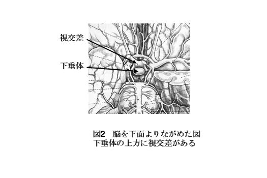 まず、下垂体とは何処にあるのか、図を用いて説明します。図1aは脳正中部を真横から見たものです。黒い矢印で示しているのが下垂体です。下垂体は、脳の正中部でトルコ鞍と呼ばれる骨のくぼみの中に存在しており、重さ約700 mg、大きさ7-8 mmの非常に小さな脳組織です。その上方には視神経 (物を見る神経)が(図2)、側方には眼球運動神経 (動眼神経・外転神経などの眼を動かす神経)が存在しております。また、その下方には、蝶形骨洞と呼ばれる副鼻腔が位置し、鼻腔内に最も近接した領域なのです。したがって、この部に発生する腫瘍に対しては、後述します鼻腔からのアプローチが可能なのです。図1bは、MRIの画像です。図1aを部分的に拡大してあります。やはり、白い矢印で示しているのが下垂体です。