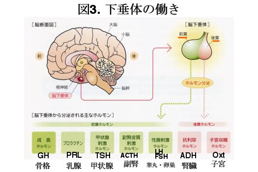 下垂体は、ホルモンの中枢であり、主として前葉と後葉に分けられ、各々、図3に示したようなホルモンを分泌し、全身の各臓器に働きかけてホルモンの分泌を促しております。