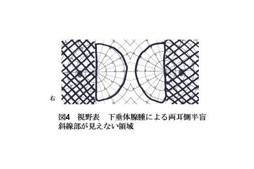(外側)半分が見えなくなる両耳側半盲(図4)という症状が一般的です。したがって、臨床的には眼科から紹介されてくることが多いわけです。しかし、視野の障害は自覚症状としては気づかれにくく、診察して初めて患者本人も気づくことがよくあります。頭痛を伴うこともよくあります。さらに正常下垂体が圧迫され、下垂体前葉機能不全症が生じます。具体的には、男性では、性欲低下や勃起不全などの性機能障害、女性では、月経不順、無月経や乳汁分泌などです。疲れやすくなり、抵抗力が低下します。さらに色白になり、腋毛や恥毛の脱落がみられる場合もあります。不妊症、特に男性不妊症の原因のひとつでもあります。