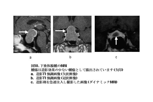下垂体腺腫の診断は何といってもMRIが有用です。特に造影剤を用いた画像の冠状断像および矢状断像が有用です。下垂体腺腫は造影効果の少ない腫瘍として描出されます (図10a,
