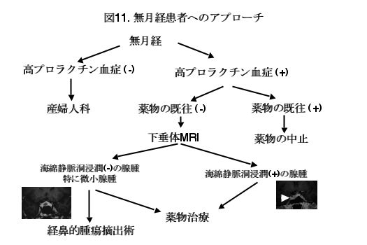 mm以下の小さな腫瘍、あるいはそれ以上の大きさの腫瘍でも下垂体の両側方部に位置する海綿静脈洞という大事な神経や血管が通過する領域に浸潤していないような症例ということになります。その他、薬剤が無効な例、薬剤を定期的に内服できない例、吐き気などの副作用の為に内服を続行できない例などは手術の適応です。無月経の患者を診たとき、治療のプロセスをどのように考えたら良いかの一例を図11に示します。手術および薬剤の長所、短所を患者によく説明し、自分の手術の技量も考慮した上で、治療法の選択をすることが望ましいと考えられます。