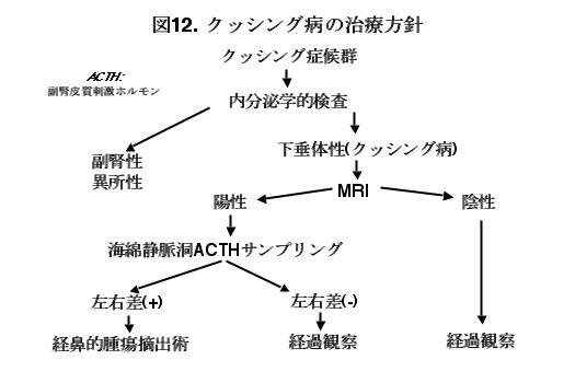 治療法の第一選択は経蝶形骨洞的手術による腫瘍の摘出です。しかしながら、この腫瘍の診断および治療は、前述のごとく、かなり難しいこと、また、再発率も他の下垂体腺腫に比べ圧倒的に高率であることなどから、この疾患については下垂体疾患の専門家に治療を委ねた方が懸命かも知れません。クッシング症候群を診た場合の治療の考え方の一例を図12に示します。手術的に摘出することが難しい領域