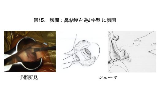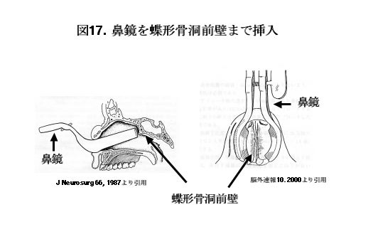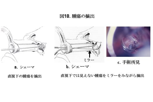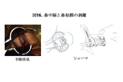 手術は一般的な気管内挿管による全身麻酔にて行います。左鼻腔の鼻粘膜に鼻中隔軟骨の前縁に沿って逆J字型の切開を加えます(図15)。次に、鼻中隔軟骨実質と軟骨膜を剥離します(図16)。さらに深部に剥離を進め、鼻中隔の下側を脱臼させ右側に圧排し、鼻中隔を中央に見ながら両側の剥離を進めます。患者の鼻孔の大きさや鼻腔の深さに応じて鼻鏡を選択し、蝶形骨洞前壁まで挿入します(図17)。ドリルを用いて蝶形骨洞前壁を開窓します。閉創時の鞍底部形成のために用いるために蝶形骨洞前壁を上手くくり抜きます。トルコ鞍底部をドリルで開窓すると硬膜が見られます。硬膜を十分に切開した後、まず、直視下に見られる腫瘍を可及的に摘出します(図18a)。次に、側方部やトルコ鞍上部前方あるいは後方に伸展した腫瘍のような通常直視下の摘出が困難な領域に存在する腫瘍に関しては、ミラーあるいは内視鏡を見ながら、直視下に腫瘍を摘出します(図18b,