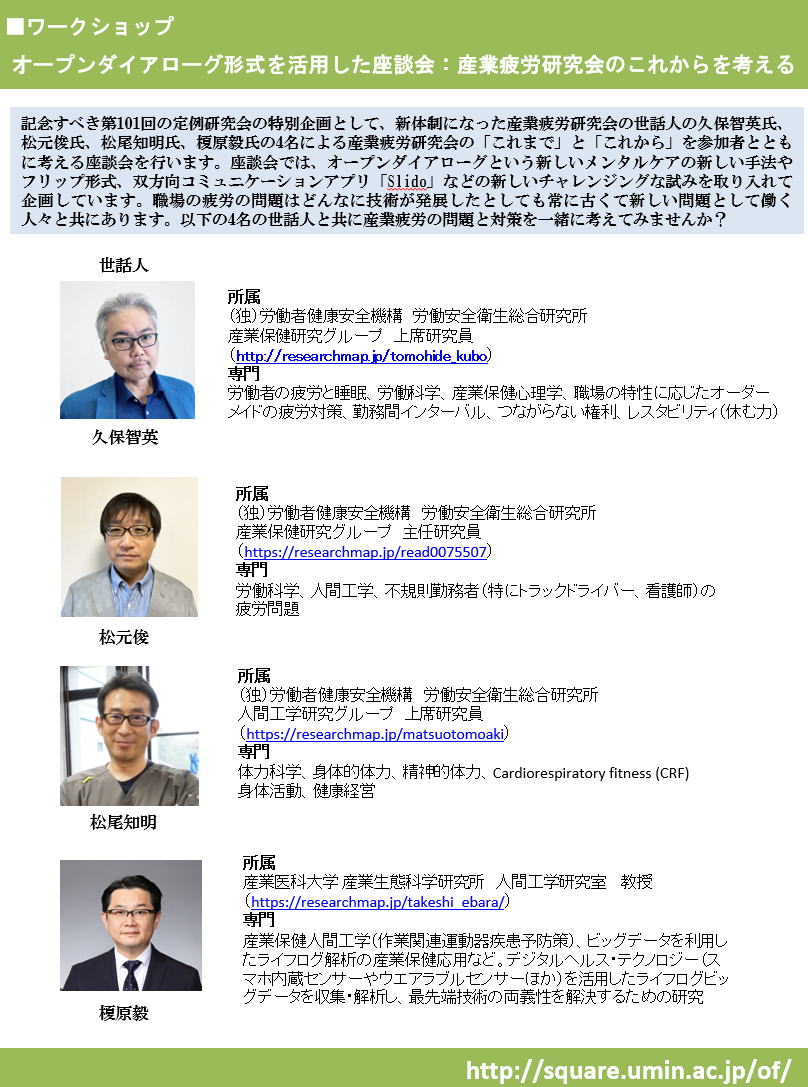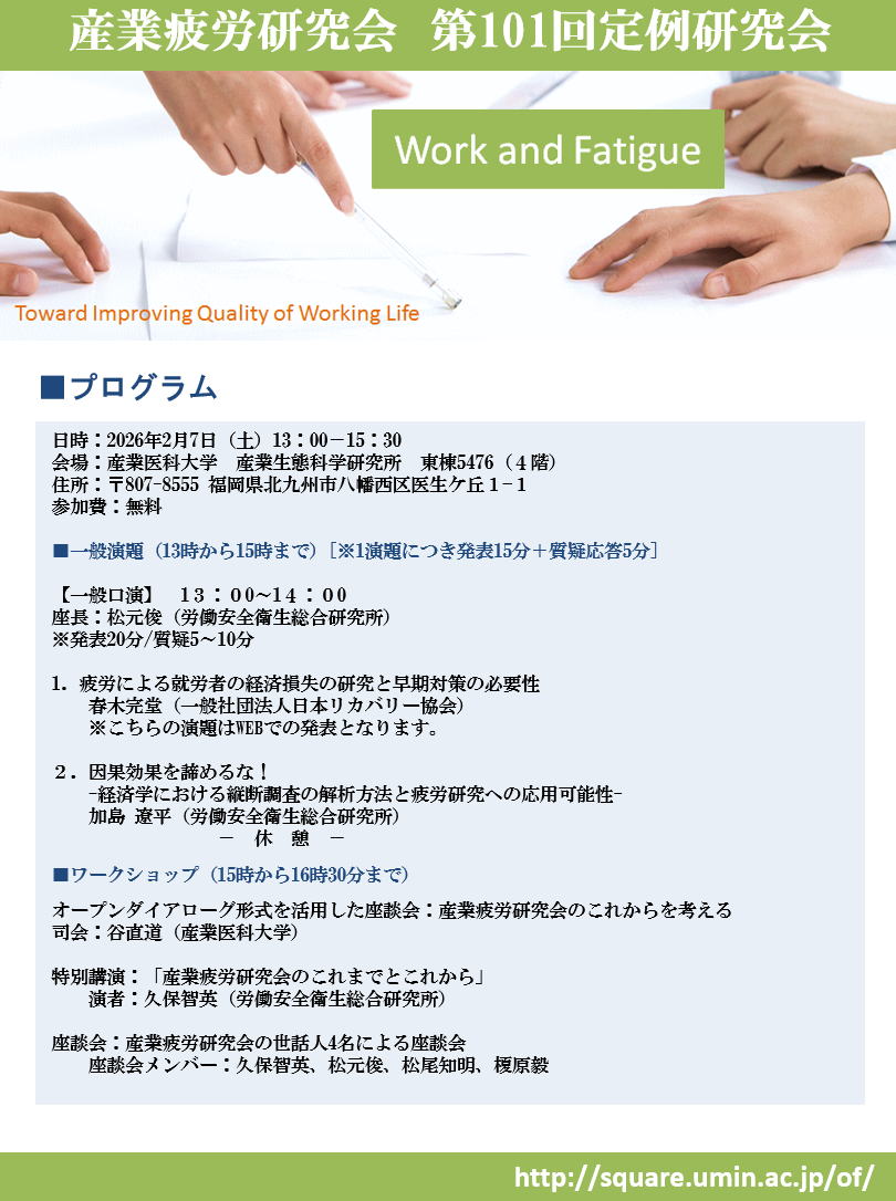 WTS www.workingtime.org)と連携しながら,労働時間のあり方を改善することを目指します.この親学会は,2年ごとに国際交代勤務・労働時間シンポジウムを主催しており,その前身の国際交代勤務シンポジウムは1982年と2001年に日本で開催されました.労働時間日本学会では,研究と実践が両立できるよう,医学や心理学などの自然科学,法学や経済学などの社会科学,そして産業保健学という学際的な視点を重視します.現在,設立の準備を進めています.2016年4月28日には,産業疲労研究会と共催で,学会立ち上げのためのミニ・シンポジウムを企画しています.詳細は今後,作成予定のホームページや産業疲労研究会のホームページ等にて掲載いたしますので,労働時間・交代勤務に関心をお持ちの多くの方々にご参加いただければ幸いです.