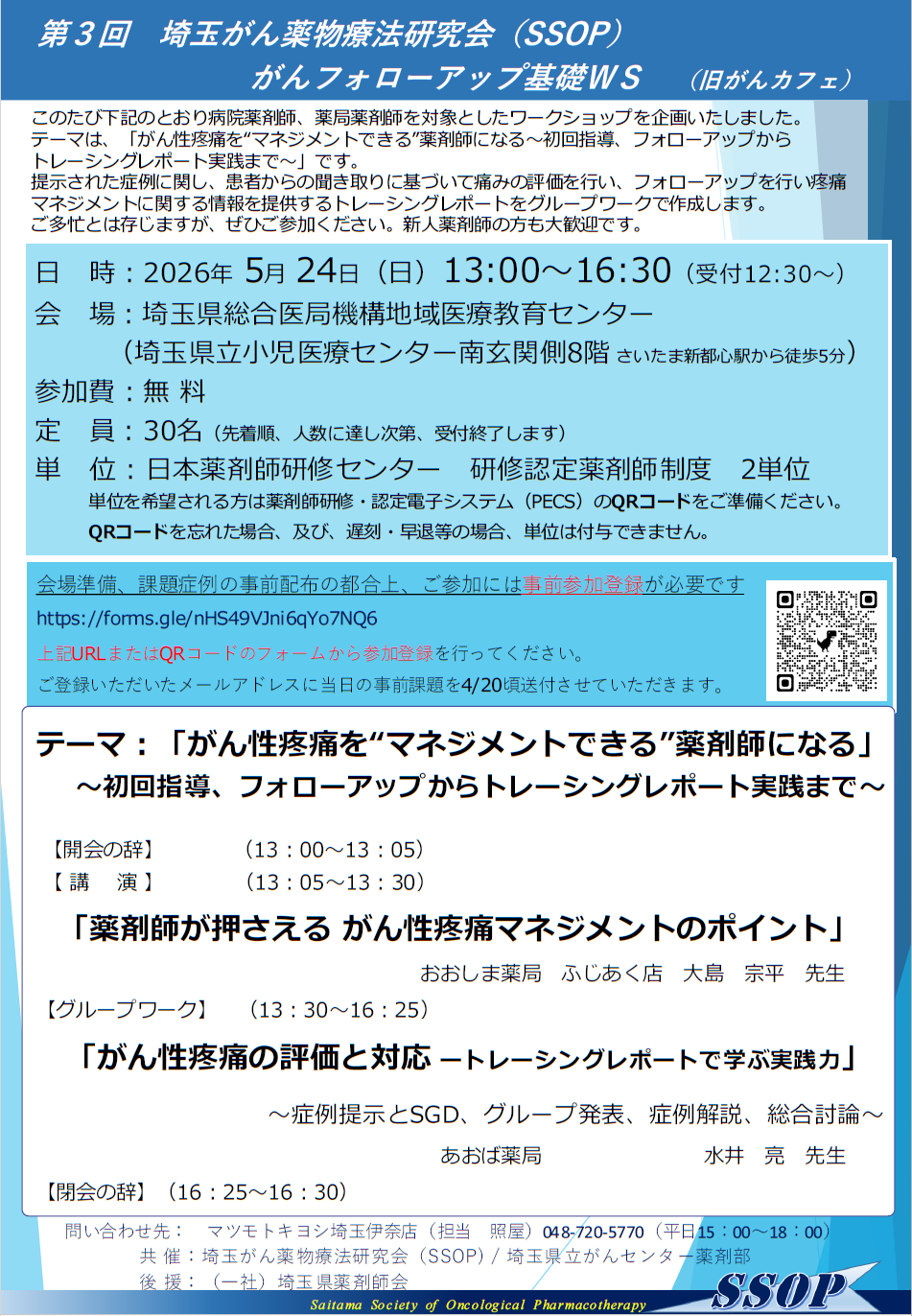 | テーマ | ・薬薬連携 ・トレーシングレポート ・がん性疼痛 |