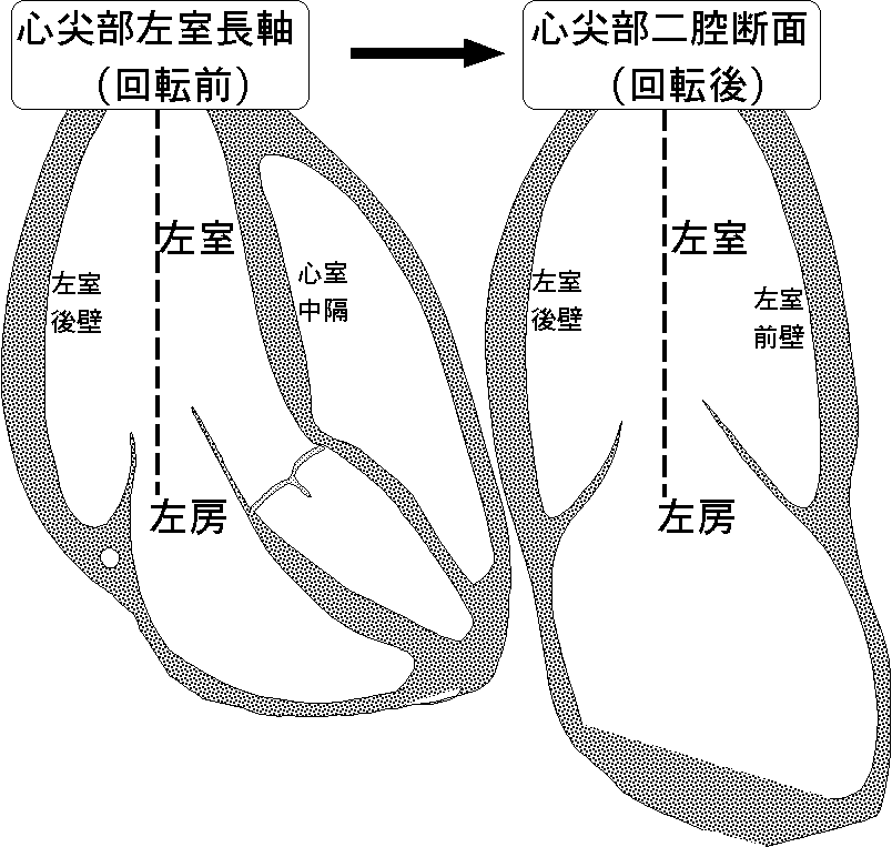 ・心尖部左室長軸から心尖部二腔への断面の移動は左室腔を画面中央に描出させながら、探触子コードを時計方向へ回転させる。