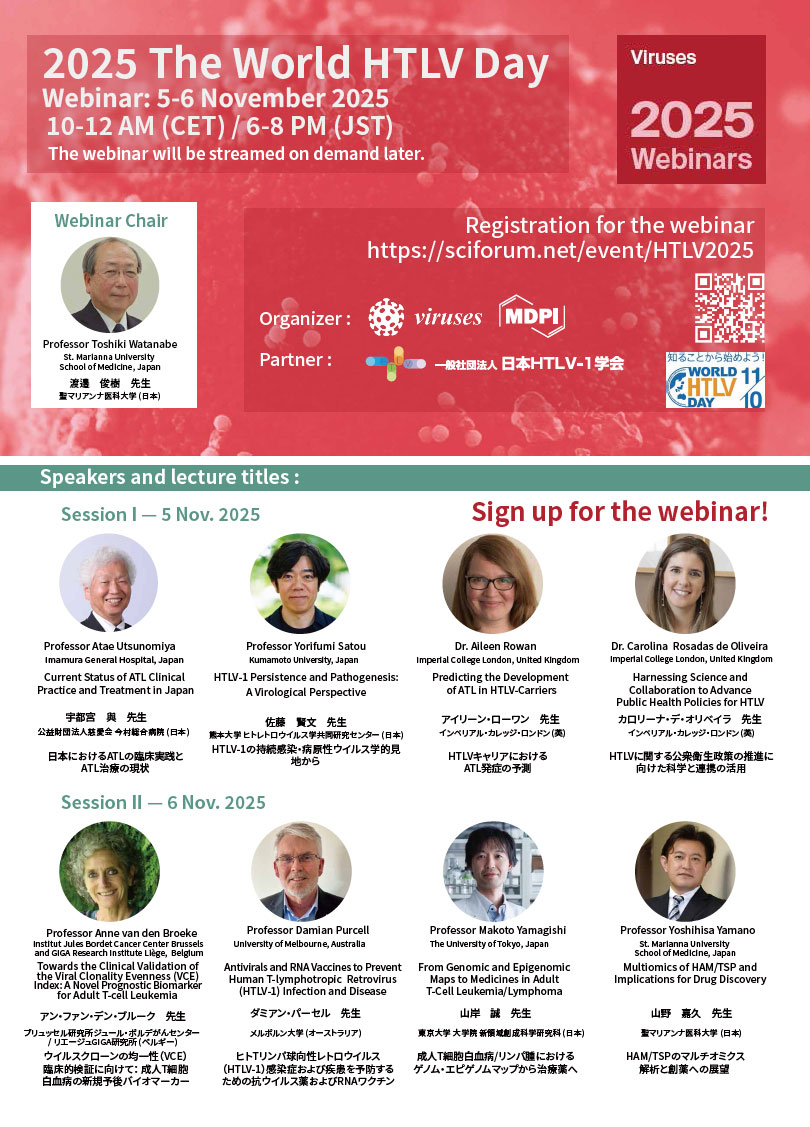 Viruses Webinar | 2025 The World HTLV Day(2025年11月5日〜6日開催)の動画が公開されました。オンデマンド配信中 Webinar Video https://youtu.be/wAfu5elaL7A Webinar Website https://sciforum.net/event/HTLV2025 |