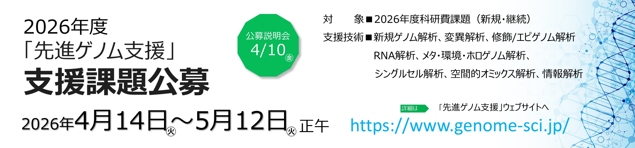 | 2026.03.26 | イベント情報に2026年度「先進ゲノム支援」支援課題公募のお知らせを追加しました。NEW 公募説明会のお知らせ:4月10日(金) 13時〜 ウェビナー(要事前参加登録) https://www.genome-sci.jp/info_session2026 |