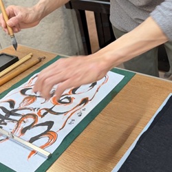 デイケアで書道教室を担当する、発達障害をもつピアスタッフが病棟を訪問し、皆さんと一緒に筆を取りました。