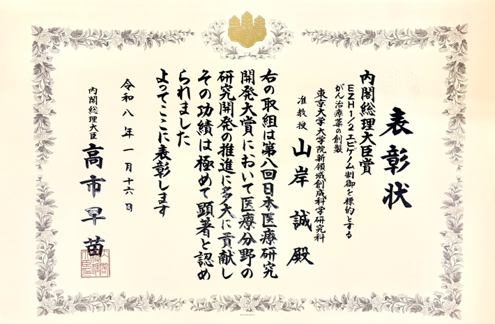 山岸誠准教授が、第一三共株式会社とともに、「EZH1/2エピゲノム制御を標的とするがん治療薬の創製」により、第8回日本医療研究開発大賞において内閣総理大臣賞を受賞しました。