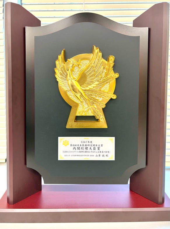 今回の受賞は、T細胞リンパ腫の発症・進行メカニズムとしてエピゲノム異常、特にヒストンメチル基転移酵素EZH1およびEZH2(以下、EZH1/2)によるヒストンの過剰なメチル化が関与していることを明らかにした山岸誠准教授と両酵素の阻害剤研究を実施していた第一三共株式会社が産官学連携により世界初のEZH1/2阻害薬バレメトスタット(エザルミア)を開発したことが高く評価されたものです。また、臨床試験において再発又は難治性の成人T細胞白血病リンパ腫および末梢性T細胞リンパ腫に対するバレメトスタットの有効性と安全性が示され、日本で早期承認を取得して多くの患者さんの治療に貢献していること、さらにバレメトスタットを他のがん種や併用療法へ展開する研究開発が進行しており、がん治療へのさらなる貢献が期待できることも、今回の受賞で高く評価されました。表彰式は2026年1月16日に首相官邸にて開催され、高市早苗首相より授与されました。