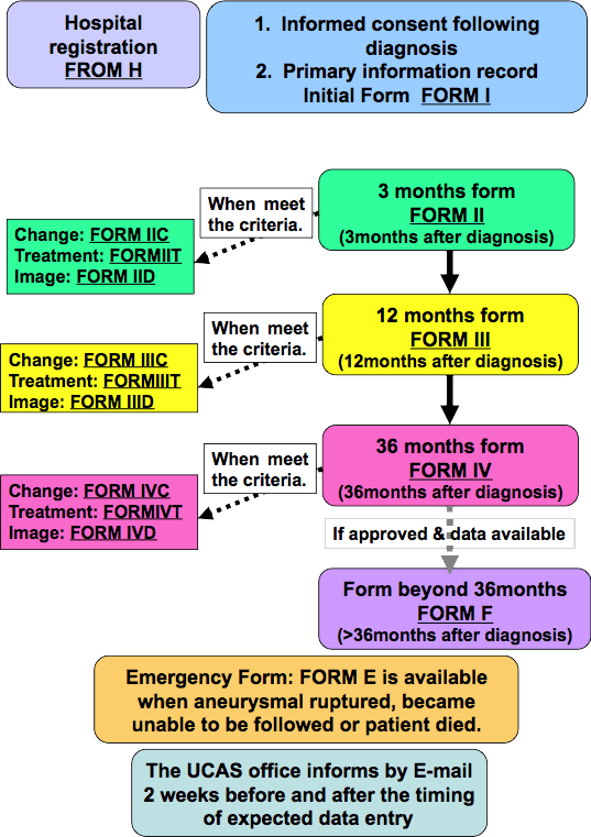 When an unruptured aneurysm is found, the patients and their families are informed about the disease and the UCAS study. When patients agree to participate in the study, their private information is recorded and the initial information is sent to the UCAS office on Form I.